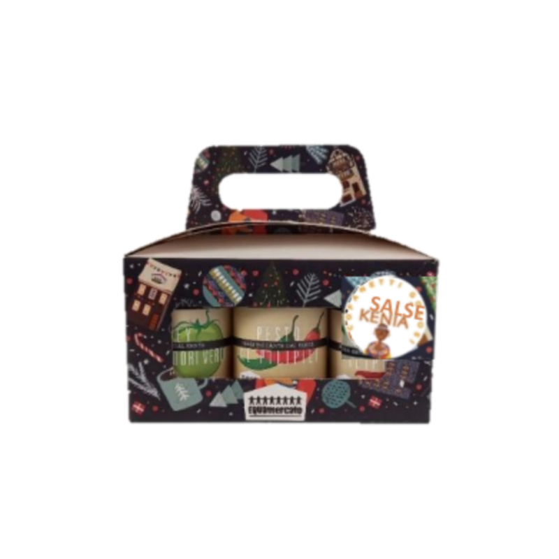 Tre barattoli di salsa dal progetto MERU HERBS, Kenya. Una confezione regalo con salsa piccante di mango, salsa di pili pili e chutney di pomodori verdi prodotti dal progetto MeruHerbs che, dal 1993, sostiene, tramite il lavoro, le famiglie della zona di Meru.